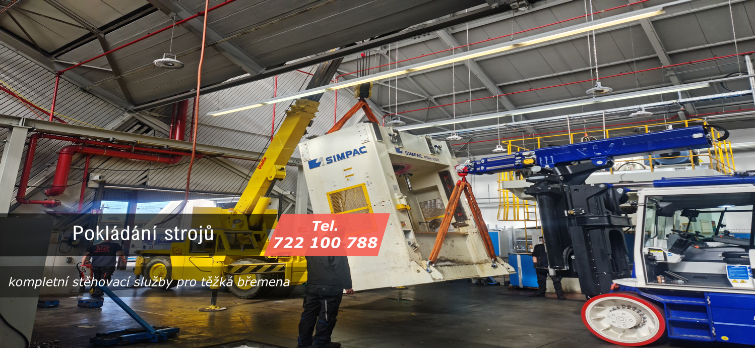 Stěhování strojů: stěhujeme veškeré stroje, strojní zařízení, strojní celky a komponenty bez váhového omezení. Zajišťujeme také stěhování těžkých břemen s nižší váhou, výškové stěhování aparárů, stěhování strojních aparátů a jiné. Dále provádíme ukotvení strojů, kalibraci strojů a geodetické měření. Specializujeme se na stěhování strojů v těžko dostupných terénech a uzavřených prostorách. Tam kde techmika končí, nastupujeme my. Zajišťujeme veškerou nákladovou a transportní techniku - jeřáb, auto s rukou, podval, podvozky, VZV, LKW, manipulační technika.